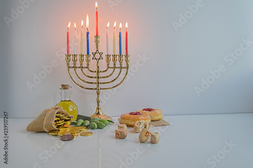 Jewish Holiday Hanukkah Celebration With Menorah Traditional Candelabra Wooden Dreidels Spinning Top Donut Olive Oil And Chocolate Coins On White Table Table Table Buy This Stock Photo And Explore Similar Images Fun Facts On Hanukkah